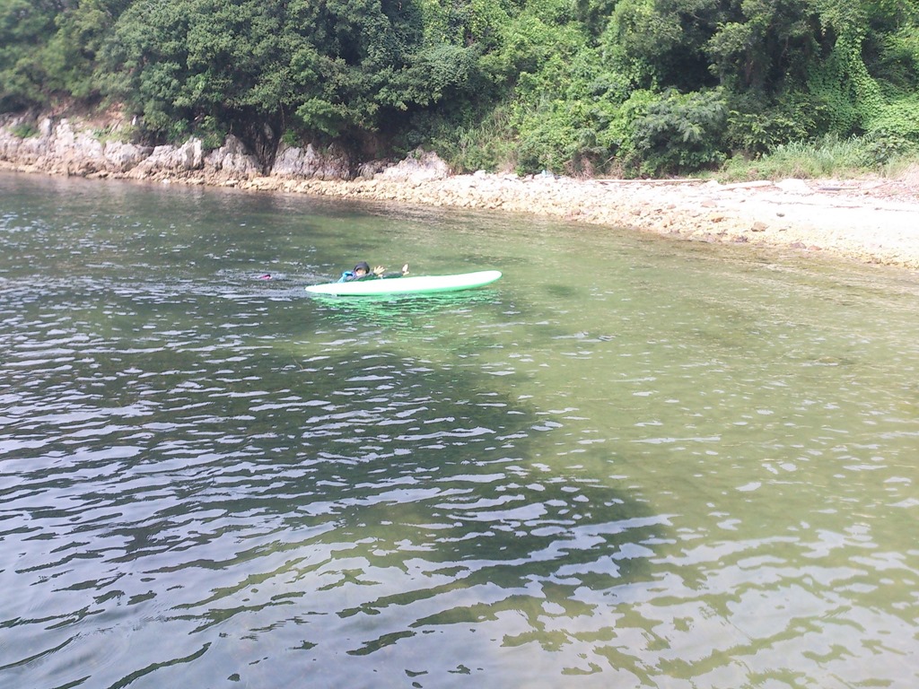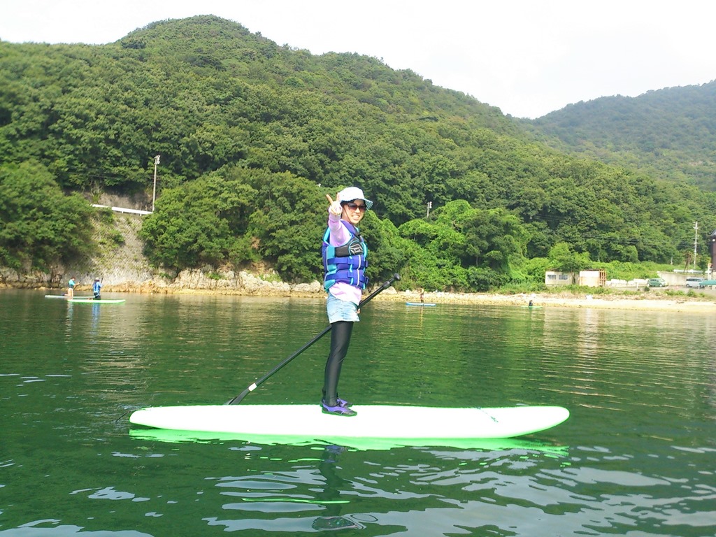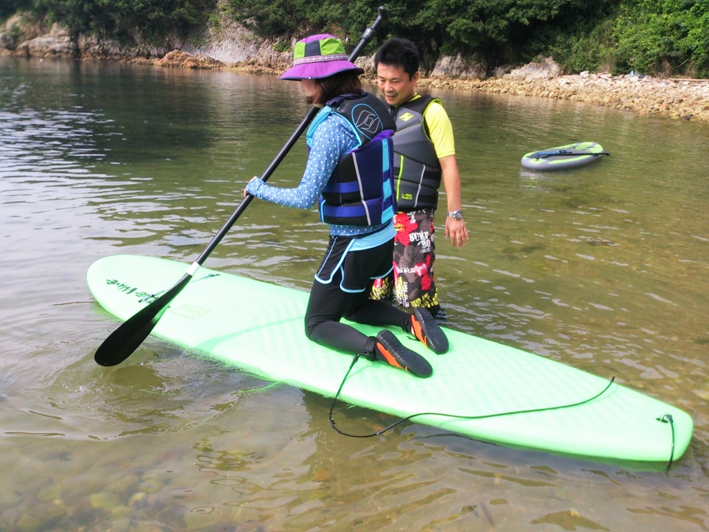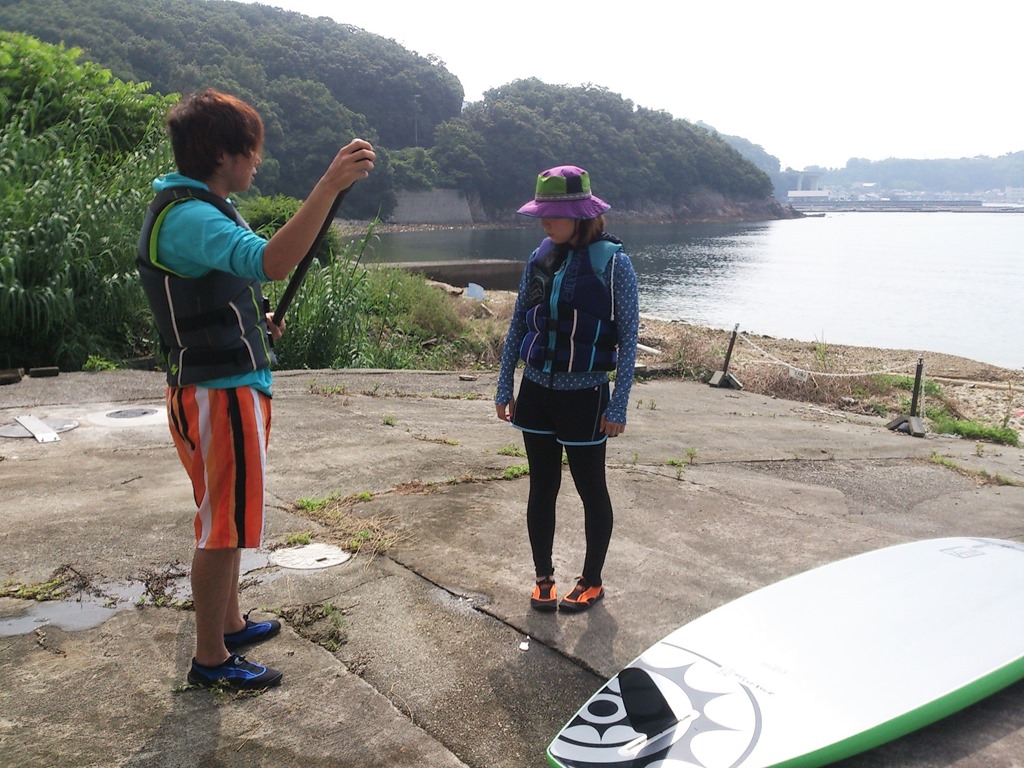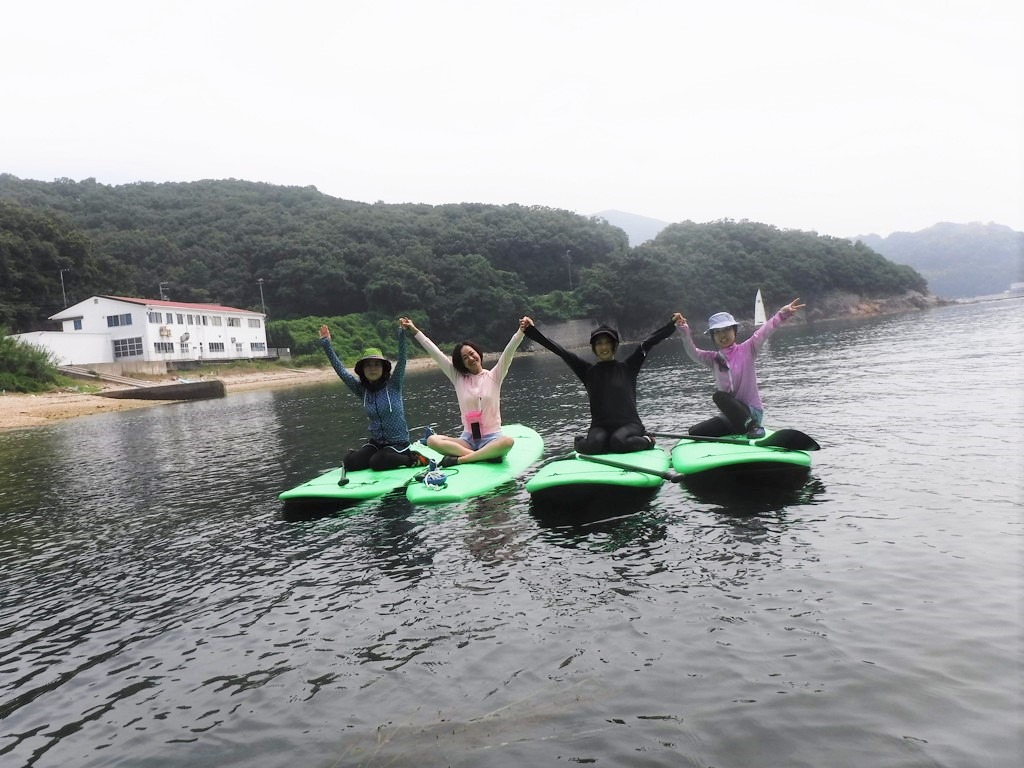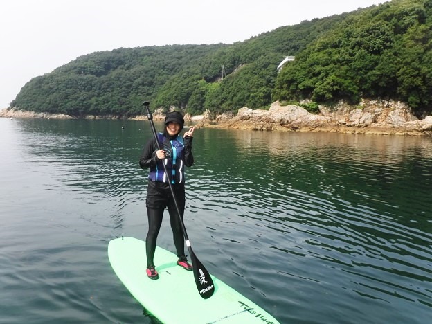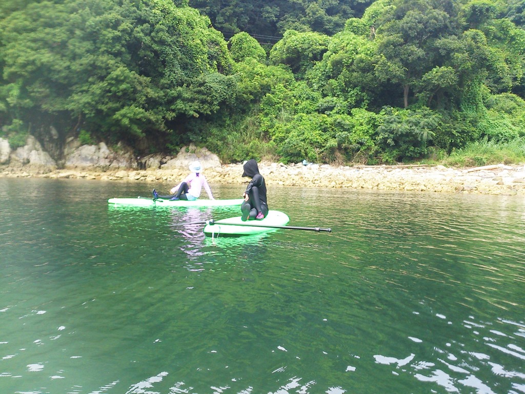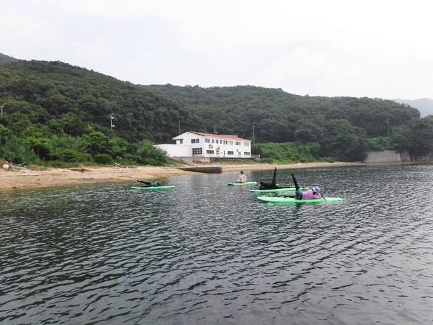 皆さん、完全防備の中、まずはSUPで海上散歩。